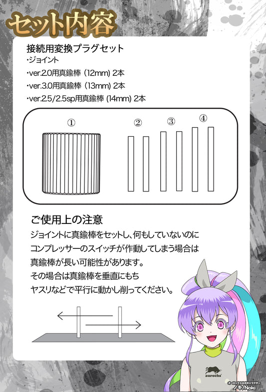 【セット内容】変換プラグ✕1、 専用真鍮棒(ver.2.0用)×2(予備含)、 専用真鍮棒(ver.2.5,ver.2.5sp用)×2(予備含)、 専用真鍮棒(ver.3.0trigger用)×2(予備含)、説明書