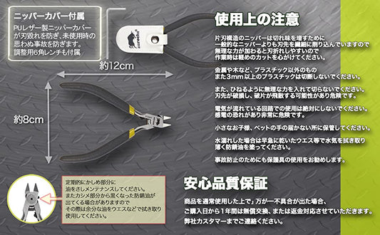 ・片刃構造のニッパーは切れ味を増すために一般的なニッパーよりも刃先を繊細に削り込んでいますので無理な力が加わると刃折れしやすいので作業時は軽めのカットを心がけてください。