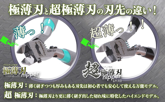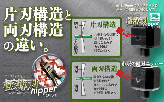 薄く繊細に研ぎ出された刃先は通常のニッパーよりも美しくゲートを切断可能です。切れ味の良い極薄片刃が片方から真っ直ぐ切断することにより プラスチックの白化も少なく切断後のヤスリがけ作業も大幅軽減、作業効率大幅アップします!!